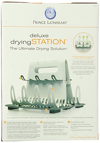 Details: Product Description The Prince Lionheart deluxe dryingSTATION is the ultimate drying solution. Prince Lionheart's top of the line drying station in a sleek modern design that is perfect for any kitchen counter. The deluxe drying station accommodates feeding accessories, sippy cups, teething toys and up to 16 bottles. It has eight large hooks to hold all shape and size of bottles and cups. The ten small hooks and grate holds bottle collars, nipples, pacifiers, teething rings, sippy cup lids and valves. Top holes are designed for utensils, straws and other small kitchen gadgets. From the Manufacturer The ultimate drying solution Prince Lionheart's top of the line drying station in a sleek modern design that is perfect for any kitchen counter. The Deluxe drying station accommodates feeding accessories, sippy cups, teething toys and up to 16 bottles. Has 8 large hooks to hold all shape and size of bottles and cups. The 10 small hooks and grate holds bottle collars, nipples, pacifiers, teething rings, sippy cup lids and valves. Top holes are designed for utensils, straws and other small kitchen gadgets. Can easily be stored when not in use.