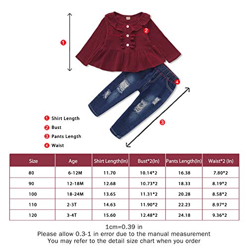 Details: MATERIAL: Soft and comfortable cotton blend material, Superior in material and excellent in workmanship No harm to toddler girls skin health. Fashion toddler girl Winter winter outfits FASHION DESIGN: Adorable ruffle shirt tops with blue denim pants set, cute and fashionable. your little girls will get lots of compliments wearing this Floral Pant Set. SEASON: For All Seasons, Perfect for daily wear, holidays, birthdays, Casual, parties, Baby Photo, Unique and Attractive. SIZE: Baby girl clothes 6-12 months 12-18months, 18-24 months Winter outfits, 2t clothes for girls, 3t outfits for girls PACKAGE INCLUDE: 1Pc long sleeve top + 1Pc denim pants. Best Gift for your little girls, worth having.