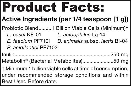 Details: Pet Dophilus is a probiotic formulation designed to help your pet maintain a balanced intestinal microbial ecosystem in order to promote intestinal health and immune function.* In addition to probiotics, Pet Dophilus also contains inulin and Metabolin. Inulin is a natural fiber that helps promote the growth of the beneficial microorganisms.* Metabolin is a supernatant powder (special blend of cell wall components and metabolites derived from the fermentation of beneficial bacteria, including Lactobacillus and Propionibacterium species), and works synergistically with the probiotic bacteria.* Each gram (approximately 1/4 teaspoon) contains a minimum of 1 billion total viable cells. Directions probiotic supplement for cats and dogs. Mix the following quantity daily into food or water - for cats and small dogs 1/8 to 1/4 teaspoon (0.5 to 1.0 g). For medium size dogs 1/4 to 1/2 teaspoon (1.0 to 2.0 g). For large size dogs 1/2 to 1 full teaspoon (2.0 to 4.0 g) or as dire