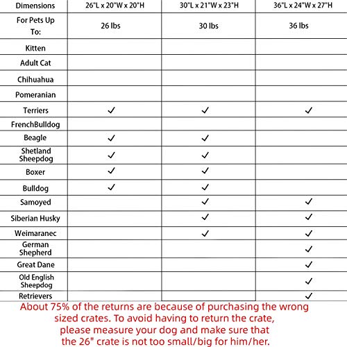 • Size: 26”L*20”W*20”H; Foldable and Lightweight Pet Crate make it easier for outdoor travel. All dimensions are measured manually, please allow deviation of 1 inch.