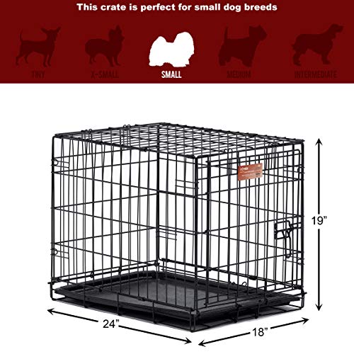 • Small single door folding dog crate ideal for dog breeds; dog weight 11 to 25 pounds; convenient divider panel allows crate to expand as your dog grows, icrate measures 24 lenght x 18width x 19 height inches
