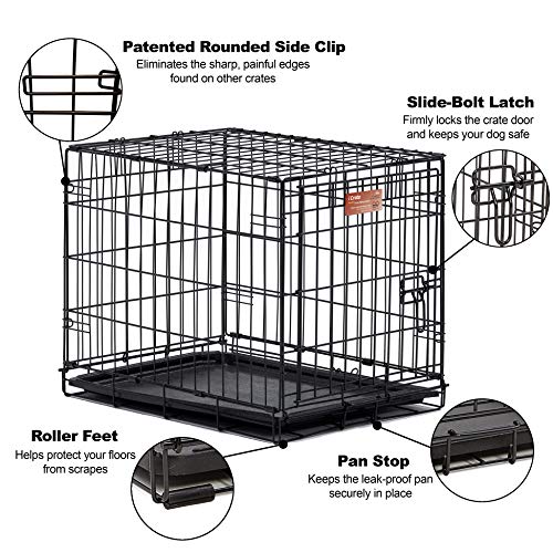 Details: The "all inclusive" iCrate, folding metal dog crate by MidWest Homes for Pets includes all of the features you will need to provide a convenient, safe & secure pet home for your best friend. This metal dog crate includes a free divider panel allowing you to adjust the size of the dog crate while your dog is still growing, a plastic leak-proof pan for easy clean-up in the event of an accident, a strong plastic carrying handle for easy portability & rubber "roller" feet on the bottom of the crate to protect your floors inside the home. MidWest iCrates also feature our patented side clips which reinforce the dog crate & reduce possible sharp points ensuring a safe experience for you and your pet. Every iCrate metal dog crate folds down flat for convenient storage. The 24" iCrate (model 1524) measures 24L x 18W x 19H inches & is suitable for "small" dog breeds. Dog Weight- 11 - 25 pounds. Please note the term "small" is subjective. For the best fit, we advise that you check the measurements of the actual dog crate against your dog's adult weight & measurements. Your dog should be able to comfortably sit upright, lay down & easily turn-around inside the dog crate. When in doubt we suggest you purchase the larger crate option. Always supervise your dog when introducing them to their dog crate & remove all collars, leashes, apparel & harnesses when using the dog crate. We at MidWest Homes for Pets understand that your dog is a part of your family & that's why we ensure our dog crates are manufactured with the highest quality control standards creating a safe home for your pet that you can feel confident with. MidWest Homes for Pets stands behind the quality of our products with our "MidWest Quality Guarantee" 1-Year Manufacturer's Warranty. If you have any questions about our dog crates our customer service department would be glad to help you. Available 9:00 AM - 4:00 PM, Monday - Friday.