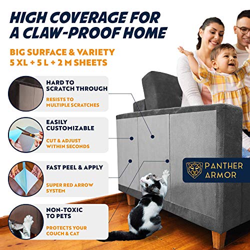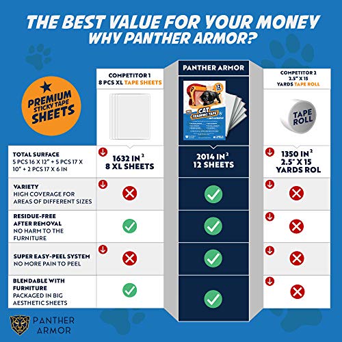 - ✔️[ TRAIN YOUR CAT INSTANTLY ] The best double-sided cat scratch deterrent tape is new in town & ready to roll. But there’s NO roll! The sheets are packaged flat & easily pliable on any corner. The anti-scratch tape sticky sheets provide more than enough cover surface for cat scratching prevention. Training your cat with Panther Armor may be the best investment in protecting your furniture. The anti-cat scratch tape can be applied on any upholstered couch, chair, doors, carpet, etc.