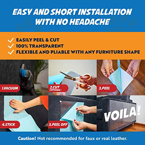 - ✔️[ VERY EASY TO APPLY ] The 100% clear tape will blend instantly with your furniture. The scratch guards will take no more than 5 mins of your time for installation, thanks to our “super easy-peel system”. 1. Quickly vacuum the area; 2. Cut the protectors and adjust their size; 3. Peel away the white backing; 4. Stick the adhesive where you want to protect; 5. Peel away the blue backing. Voila! The best protection on your furniture. No more cats will “stick” around, for sure 😊