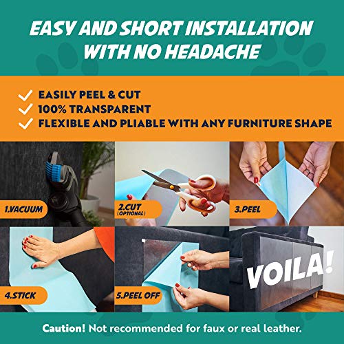• ✔️[ VERY EASY TO APPLY ] The 100% clear tape will blend instantly with your furniture. The scratch guards will take no more than 5 mins of your time for installation, thanks to our “super easy-peel system”. 1. Quickly vacuum the area; 2. Cut the protectors and adjust their size; 3. Peel away the white backing; 4. Stick the adhesive where you want to protect; 5. Peel away the blue backing. Voila! The best protection on your furniture. No more cats will “stick” around, for sure 😊