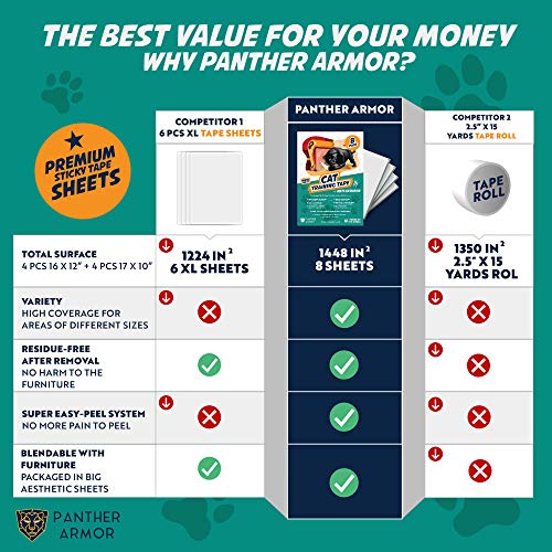 • ✔️[ TRAIN YOUR CAT INSTANTLY ] The best double-sided cat scratch deterrent tape is new in town & ready to roll. But there’s NO roll! The sheets are packaged flat & easily pliable on any corner. The 4 XL and 4 L anti-scratch tape sticky sheets provide more than enough cover surface for cat scratching prevention. Training your cat with Panther Armor may be the best investment in protecting your furniture. The anti-cat scratch tape can be applied on any upholstered couch, chair, doors, carpet, etc.