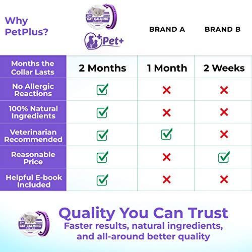 • 🐈 Works fast and longer-lasting calming collar for cats. Stress relief for cats need not cost too much too often. Some cat care products and kitten supplies last only a short time. Calming spray for cats or any lavender spray may reduce cat aggression and make a cat calmer for a while but they quickly fade. Other branded calming cat collar quickly come off. But PetPlus Cat calming collar for cats has a lock that keeps the collar in place and is the only one that lasts up to 2 months.