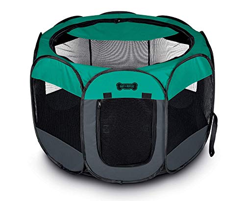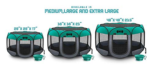 Details: Portable Pet Playpen, Medium 29" x 29" x 17" Portable Play Pen can be used to keep your pet safe and secure in any environment. Can be used as an exercise kennel for your Pet! Can be used for Dogs, Cats, Rabbits, and other pets. Use indoors and outdoors. Great for Travel, Camping, Trips to the Park, Relaxing Indoors, House Training, Exercise. BONUS: Includes carrying case + collapsible pet food bowl. Medium 29" x 29" x 17" We stand behind our product! 100% Satisfaction Guaranteed. FEATURES INCLUDE:► Durable Material and reinforced corners. Made of ultra-durable 600D Nylon ►Breathable Mesh in the door, windows and removable roof. Removable zippered top can be removed easily removed for indoor use & closed for outdoor use to provide shade. ►Zippered door provides easy in/out access for your pet. Close the door to keep your pet safely inside. ► Spacious and Roomy 8-Panel interior allows plenty of room for your pet to exercise or relax comfortably. ► Provides a secure and safe environment for your pet ►Water-resistant material ►Removable Mesh roof with easy zipper► Lightweight yet sturdy► No assembly required. Pops open and fold flat for easy storage and travel► Comes in Medium and Large Bonus Collapsible bowl for food or water► Includes clip for easy accessibility while traveling ►FDA Grade silicone is safe for all pets► Easy wash clean with soap and water; not dishwasher-safe Bonus Carrying Bag provides easy and convenient way to transport you Pet Playpen►Handle for easy carry. ► Zippered carry pouch for maximum security. PACKAGE CONTENTS: 1 Pet Playpen, 1 Carrying Case, 1 collapsible food bowl