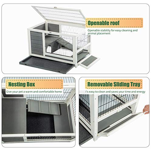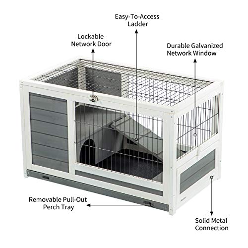 - 【Spacious Space & User-friendly Design】 This rabbit cage comes with a hideout rest area and ramp, providing safety space for your lovely bunnies. There is a sliding ramp allows poultry to easily enter the raised housing area. There are timber ridges above the ramp to protects your poultry from slipping back. Overall dimensions: 35.4" x 20.9" x 20.9"(L x W x H)