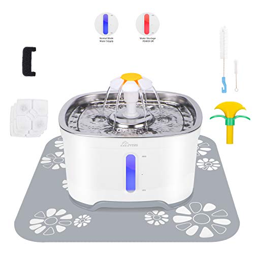 Cubic Cat Water Fountain Stainless Steel, Pet Water Fountain with Intelligent Pump and LED Light, 2.5L Cat Fountain with Water Level Window, 3 Carbon Filters, 1 Foam Filter 1 Mat and Cleaning Brushes