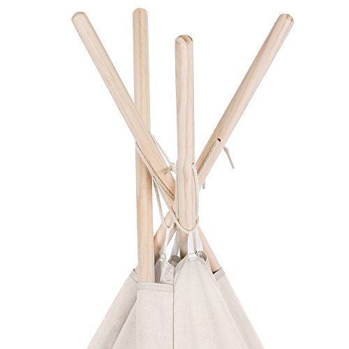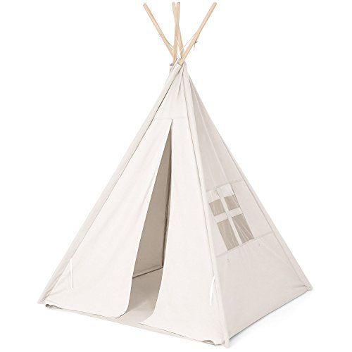 Details: Oh, the adventures you'll have! This cotton canvas kid's teepee tent offers a fantastic space for children to play, pretend, read, nap, and more! Inspire little dreamers to use their imaginations and visit far-off lands, all from the comfort of your backyard or living room! Specifications: Overall Dimensions: 49"(L) x 52"(W) x 70.5"(H) Interior Dimensions: 45"(L) x 45"(W) x 55"(H) Mesh Window: 14"(L) x 13"(W) Carrying Bag: 45"(L) x 5"(Dia) Weight: 7.7 lbs. Includes: 1 tent body, 4 wooden poles, 1 carrying case Material: Cotton Canvas Frame Material: Wood Carrying Bag Material: Cotton Canvas Color: White Intended for indoor use only Flame-retardant, ASTM F963 safety standards For children ages 4 and up Assembly required (instructions included)