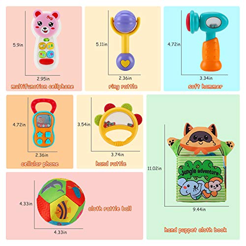 - 7 PCS RATTLES KIT: multicolor infant grabbing toys set including cloth Rattle ball, early education cloth book, hand drum, multifunctional mobile phone (powered by battery, not included), hammer, mobile phone,grab'n shake rattle, 3D hand puppet cloth book.More Choice for Your Baby.Great montessori baby toys 0-6 months.