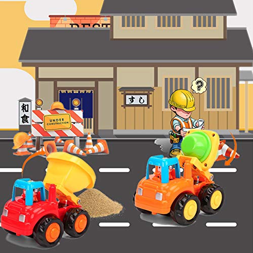 Details: Friction Powered Cars Push and Go Trucks Construction Vehicles Toys Set of Tractor Bulldozer Dump Truck Cement Mixer for Baby Toddlers Infants Boys Baby Toy Car for Toddlers Baby -Toy for Baby Infant Toddler Boy & Girl, Role-Play Fun Toy Gifts for 18Months 20Months 24Months Friction Powered Cars, Push and Go Toy Trucks Construction Vehicles Toys Set for Baby Toddlers- Dump Truck, Cement Mixer, Bulldozer, Tractor, Early Educational Cartoon ( Set of 4) The perfect choice for baby's first car! A fun add-on to any child's car collection. It is the perfect idea for baby infant toddler boys and girls as First Birthday Gift, Christmas Gifts, Thanksgiving Gifts, Birthday Gifts, Easter Gifts, Baby Gifts, etc. Bulldozer: The arm of the bulldozer can move up and down, each joint of it can move flexibly to form differently. Farm tractor: Fun cartoon driver will amuse your baby, the carriage can be jointed to the main body to carry small items, and the rear door can be opened or closed exercising the flexibility of baby's hands. Dump truck: Rotating car hopper can discharge the building materials conveniently. Cement truck: The mixer can rotate up and down and discharge the cement, letting kids know the principle of mechanical automation, cultivating their creativity and manipulative ability. Material: High quality, durable plastic. Long lasting friction power. Perfect for little hands. Package Includes: 1 * cement truck (2.6 x 3.5 x 2.8 inches) 1 * dump truck (2.6 x 3.5 x 2.8 inches) 1 * bulldozer (2.8 x 9.3 x 5.9 inches) 1 * farm tractor with wagon. (2.8 x 6.5 x 2.8 inches)