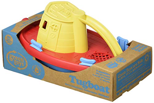 Details: This colorful yellow, red, and blue boat floats great, making it the perfect toy for water play in the tub, the pool, and even at the beach. It has a handle from the wheelhouse to the back deck and a wide-mouth spout at the front to scoop and pour water. Kids love making waterfalls out of the spout, while parents love that it makes bath time (especially hair washing!) fun and enjoyable. The molded detailing on the front of the 100% recycled plastic Green Toys Tugboat wheelhouse features the lettering “S. S. Green Toys,” along with a ladder, life preserver, anchor, lights, and horns. There are also five windows through which you can see the captain’s seat and steering wheel. The deck has simulated cargo net under the arching handle, which, when the boat is submerged, allows the hull to fill with water that then pours out the front spout.