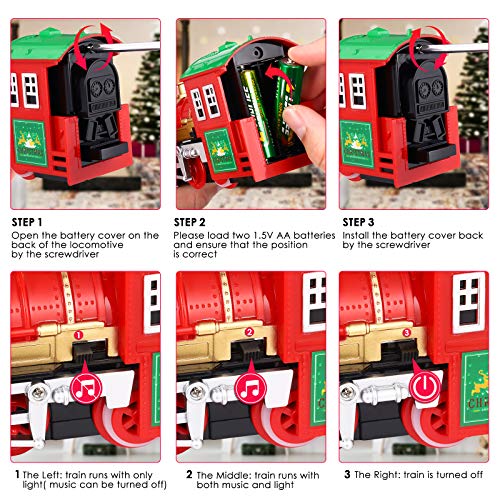 • 【CLASSIC TRAIN SET WITH LIGHT & SOUND】 The electric train set features a locomotive engine (require 2 AA batteries but not included in this train set), 3 cars, and 12 tracks (6 curved & 4 straight tracks), 2 trees and 1 Xmas themed cardboard for Decoration. The train toy set with light and music effects will entertain your kids for hours