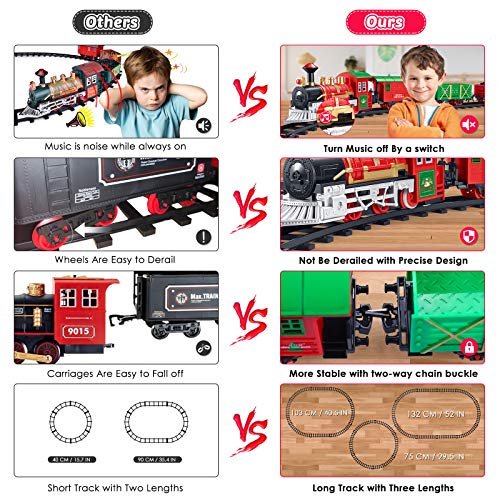 • 【CUSTOMIZABLE MUSIC SYSTEM】 The toy train set has realistic train sounds, so we specially set up an on/off system for the music. Unlike other train set, The music can be turned off to enjoy a more comfortable train journey while the train is running if you think the sound is too noisy.