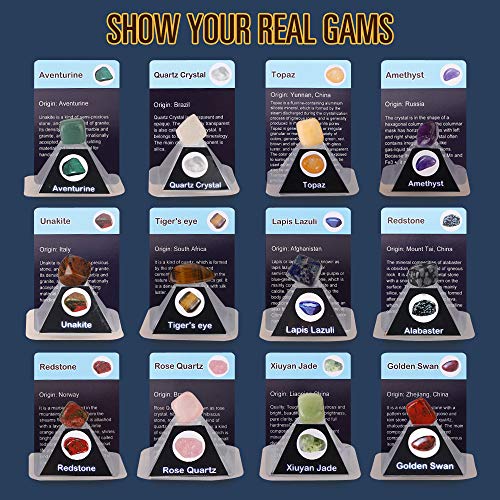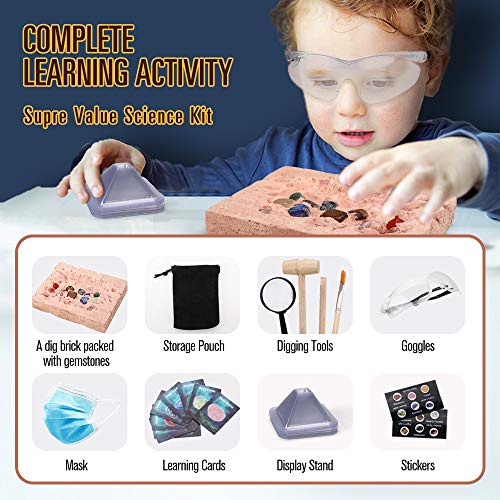 - 3 IN 1 STEM ACTIVITIES FOR KIDS: Our gemstones science kit includes a large dig brick and the excavation tools, which is designed for children to dig up and find the genuine stones, display their proud by the rock collection stand. And learn more knowledge about the stones from the science cards