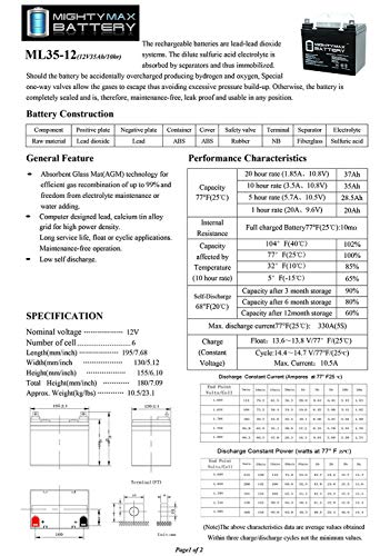 Details: Delivering power when you need it, the Mighty Max ML35-12 12 Volt 35 AH uses a state of the art, heavy-duty, calcium-alloy grid that provides exceptional performance and service life in both float and cyclic applications. The ML35-12 is an Absorbent Glass Mat (AGM) technology with a valve regulated design, that can be used in enclosed and indoor environments without leaking or maintenance, providing a superior performance for thousands of models. Mighty Max SLA batteries are utilized in a wide variety of applications including; Consumer Electronics, Electric Vehicles, Engine Starters, Golf Carts, Hunting, Lawn and Garden Tools, Medical Mobility, Motorcycles, Power sports, Portable Tools, Solar, Toys and Hobby, Access Control Devices, Emergency Lighting, Security and more. Specifications: Voltage: 12 Volt Amperage: 35 AH Chemistry: SLA, AGM Quantity: 2 Batteries Battery Dimensions: 7.68 in x 5.16 in x 7.13 in Weight: 23.15 Lbs Warranty 1 Year Genuine Mighty Max battery Product