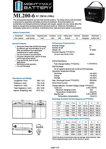 Details: Delivering power when you need it, the Mighty Max ML200-6 Internal Thread 6 Volt 200 AH uses a state of the art, heavy-duty, calcium-alloy grid that provides exceptional performance and service life in both float and cyclic applications. The ML200-6 Internal Thread is an Absorbent Glass Mat (AGM) technology with a valve regulated design, that can be used in enclosed and indoor environments without leaking or maintenance, providing a superior performance for thousands of models. Mighty Max SLA batteries are utilized in a wide variety of applications including; Consumer Electronics, Electric Vehicles, Engine Starters, Golf Carts, Hunting, Lawn and Garden Tools, Medical Mobility, Motorcycles, Power sports, Portable Tools, Solar, Toys and Hobby, Access Control Devices, Emergency Lighting, Security and more. Specifications: Voltage: 6 Volt Amperage: 200 AH Chemistry: SLA, AGM Battery Dimensions: 12.00 in x 6.65 in x 8.75 in Weight: 63.50 Lbs Warranty 1 Year Genuine Mighty Max battery Product