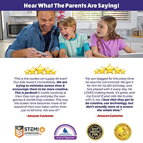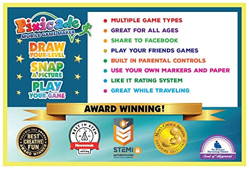 Details: ***WINNER***2019 Stem.Org Authenticated Educational Product...2020 National Parenting Center Seal of Approval...2020 Gold Award Recipient Mom’s Choice Awards (Honoring excellence in family-friendly media, products, and services)...2020 Tillywig Award Winner for Best Creative Fun. Pixicade Mobile Game Maker sets a new standard in both entertainment and learning. Appealing to wide spectrum of interests: kids that love drawing, kids that love video games, kids that like solving puzzles...they all are amazed at seeing their creations come to life! Parents love it because kids actually put down their phones or tablets and pick up markers and paper. Kids love it because they can draw their own games, share them with their friends, and play them on their phone or tablet. Create up to 1600 games on one device or up to 800 games on two devices. Pixicade extremely is easy to use. Kids get to draw a picture of an idea for a video game using colored markers and real paper. Then, using the Pixicade app available for iOS and android, all that is needed is to snap a pic of the piece of paper! The image is then brought to life as an actual video game that can be played on a phone or tablet! The app only requires a camera and an internet connection. (iOS 8.0 and up, android 6.0 and up) Pixicade was created by a high school art teacher who saw imagination and creativity in students decreasing. Included in every boxed kit are 5 washable colored markers, instructions with 2 unique QR codes and 3 guide books that are specifically created to help kids focus on designing. The guidebooks train kids how to create games by teaching them over 50 game designing concepts. These include training on developing mechanics and game design of avatars, movement, hazards, and more. Over 100 game examples and concepts are illustrated for inspiration. Have fun with the 33 activities and 44 drawing pages. See product photographs or video for examples.