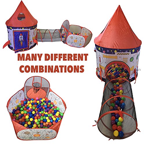 - ASTRONOMY TOYS FOR KIDS ★ Your child will take off into an outer space adventure with this 3-piece playhouse castle tent, crawl tunnel & basketball pit with hoop. With our one of a kind space shuttle rocket ship design, their imaginations will come alive as they enjoy endless hours of space exploration while crawling & playing in the playland ball pit.