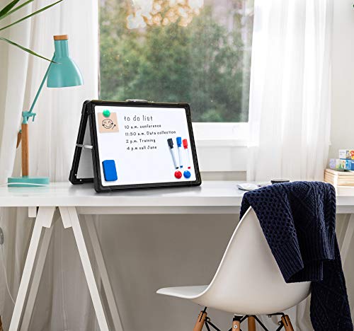 - PORTABLE DRY ERASE BOARD SET: The 12"x 16" portable teaching board is portable and is lightweight with handle on top. It comes with 3 magnetic pens, 3 magnetic piece and 1 dry eraser which can be kept between the white boards when not in use. No need to worry about losing the accessories. Children can carry this by themselves from room to room, and teachers do not have to go back and forth to their large wall whiteboard while teaching in small groups.