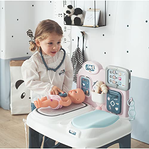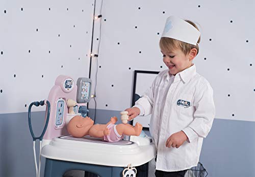 Details: Your child will be able to play pediatrician, to examine and to treat little pains of his baby doll with this care center! Several play areas and accessories are included to reproduce medical gestures: a self-adhesive doctor's label, doctor's glasses, electronic tablet (batteries not included), rotating screen with vision test and heartbeat, health record booklet to personnalize, and medical forms, baby scale with spring and digital effect screen, removable measuring rod, examination table with IML, stethoscope, thermometer, otoscope, reflex hammer to check the motor functions of his baby doll, cough syrup, spoon, cream, mechanical action syringe, box of plasters, self-adhesive plasters, cloth diaper, baby bottle, storage bin, first aid box with tilting drawer, shelf under the product, and hooks. The removable electronic tablet will enable your child to play with the baby doll and the accessories. An LED light and a sound are triggered randomly indicating to the child what is wrong and what to do. 1 doll of 11.81 inches with pee function is included. Suitable for ages 3 years and up. WARNING: CHOKING HAZARD -- Small parts. Not for children under 3 yrs.