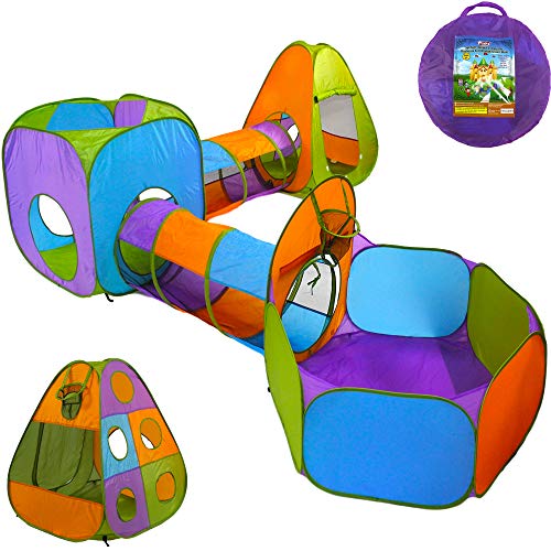 Playz 5-Piece Kids Pop up Play Tent Crawl Tunnel and Ball Pit with Basketball Hoop Playhouse for Boys, Girls, Babies, and Toddlers (Purple, Orange, Yellow, Red, Blue)