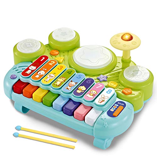 fisca 3 in 1 Musical Instruments Toys, Electronic Piano Keyboard Xylophone Drum Set - Learning Toys with Lights for Baby & Toddler 1 2 3 Year Old Boys and Girls