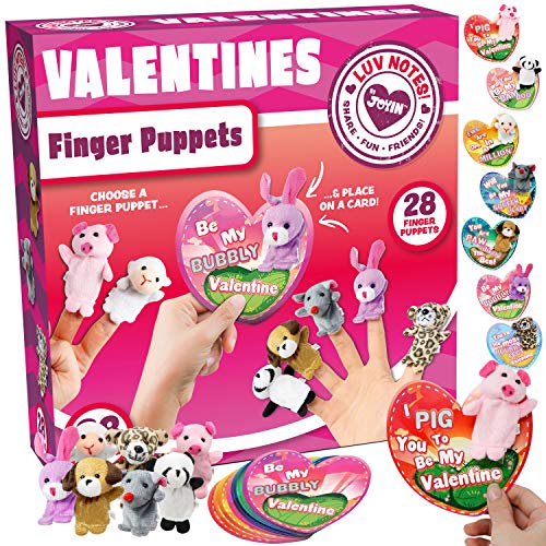 JOYIN 28 Packs Valentines Day Gift Cards with Animal Finger Puppet Set for Kids Party Favor, Classroom Exchange Prizes, Valentine’s Greeting Cards, Stressrelief Hand Puppets (Animal 1)