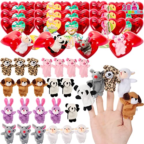 JOYIN 28 Packs Valentines Day Gift Cards Prefilled with Animal Finger Puppet and Heart Box Set for Kids Party Favors, Classroom Exchange Prizes, Valentine’s Greeting Cards