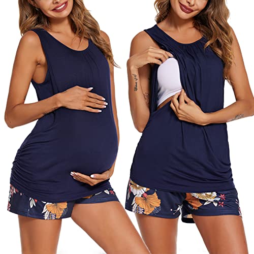 Ekouaer Sleeveless Maternity Women Top Nursing Pajamas Set Side Ruched Maternity Pj Set Nursing Pjs Set for Pregnant Wear Floral Navy Blue M