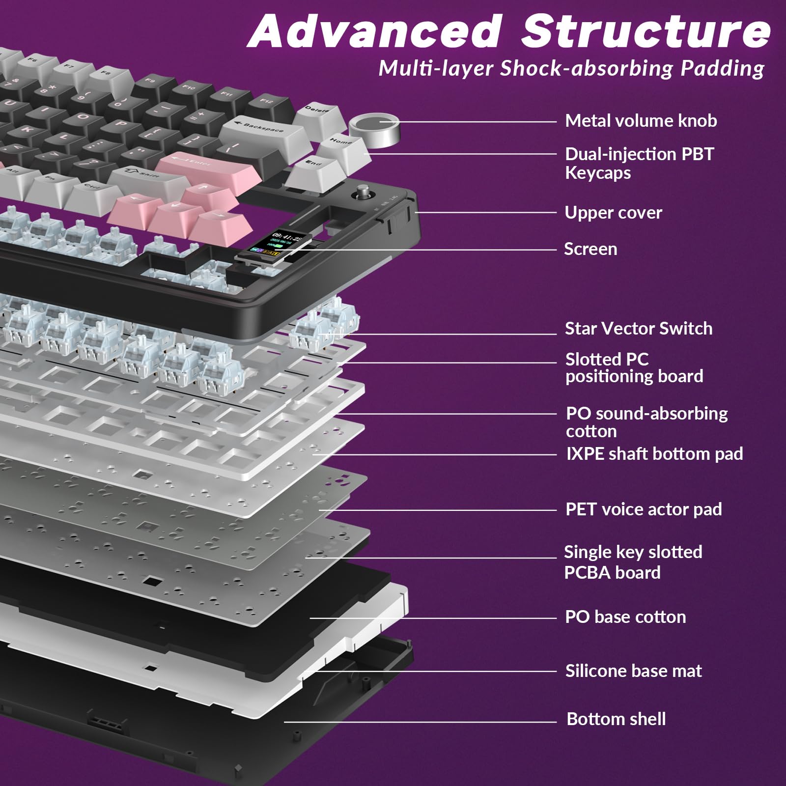 - Creamy Keyboard with Advanced Structure: The S75 Pro thocky keyboard features an advanced structure, extended integrated silicone pad, and PCB single key slotting, better optimizes resilience and stability, making the hand feel softer and more elastic. Five layers of filling silencer fills the gap between the PCB, the positioning plate and the shaft, effectively counteracting the cavity noise sound of the shaft hitting the positioning plate, and providing a solid feel