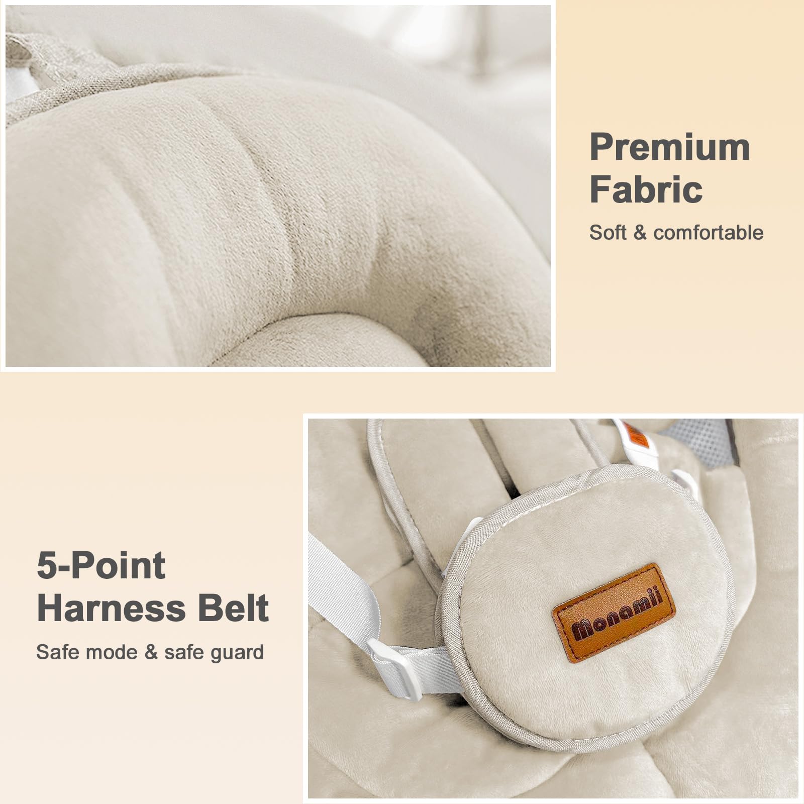 - ELEGANT INFANT SWING -- Wood grain wallpaper on baby swing has a real wood grain visual effect, the color scheme and way it looks that gives it a very modern feel to it. Monamii bluetooth baby swing fits in with home decor and doesn’t appear cheesy and and an eye sore