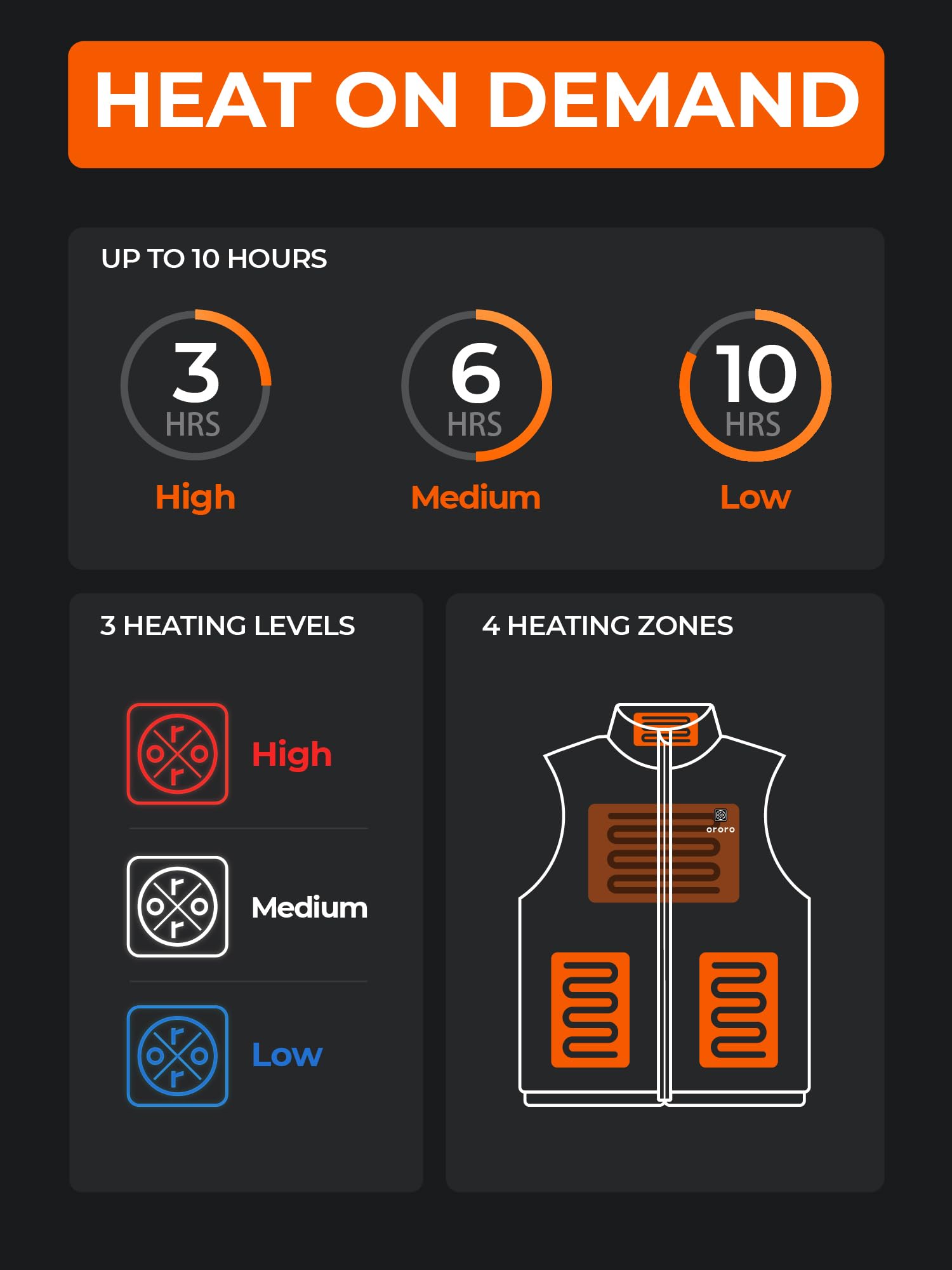 - KEEP YOUR BODY AND HANDS WARM: Four carbon fiber heating elements generating heat across the collar, mid-back, as well as underneath two pockets for core-body warmth. Three available heating settings can be adjusted with just a simple press of the button.