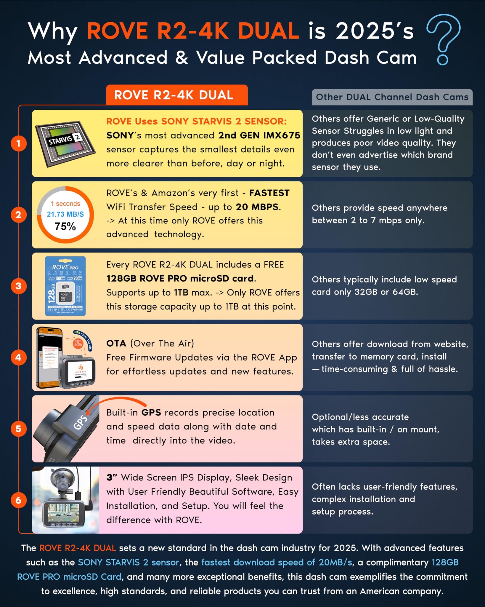 - ULTRA FAST 5G WIFI/ UP TO 20MB/s DOWNLOAD SPEED – With its built-in dual-band 5GHz and 2.4GHz WiFi, you can use the ROVE dash cam app to view and manage dash cam recordings instantly on your iPhone and Android smartphone. By using the ROVE app, download your recorded videos directly to your smartphone at a speed of up to 20 MB/sec and then easily share these on social media with friends and family. Additionally, manage camera settings and update the latest firmware over-the-air via the ROVE App.
