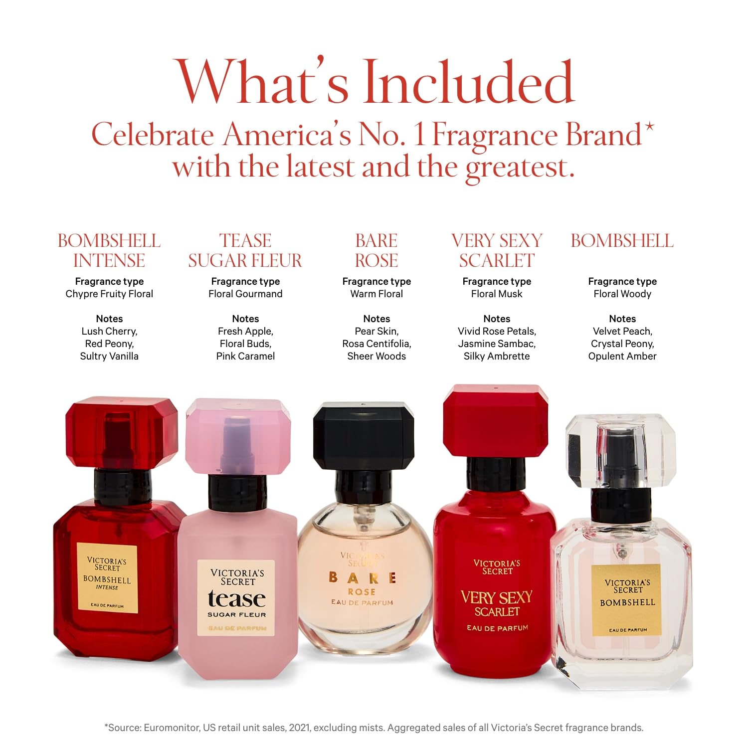 - Bombshell Intense Eau de Parfum. Fragrance type: Chypre Fruity Floral. Notes: lush cherry, red peony, sultry vanilla.