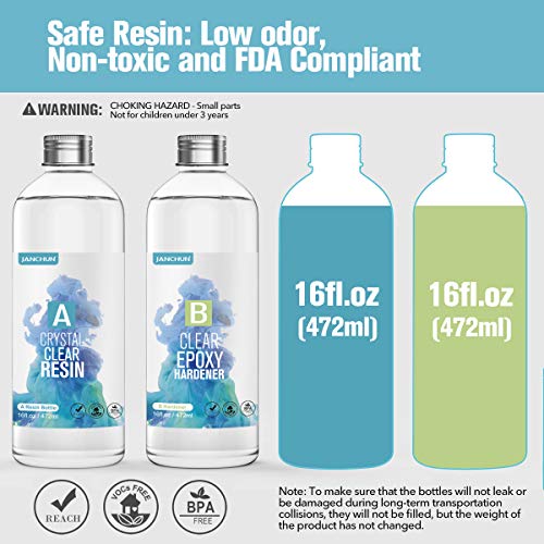 Details: JANCHUN EPOXY AB GLUE are certified non-toxic and safe for all your artistic creativity. Features and Details to make a better use: ✔ Two 16 oz bottles (32 oz total) ✔ 1:1 mix ratio by volume ✔30 minute work time and 24 hour cure time (may vary slightly with temperature and humidity) ✔ BPA and VOC FREE – No respirator needed ✔ Self-leveling and Self-degassing, UV and Heat Resistant ✔ Surface must be dry and free of duct ✔ Used for all of your coating for Canvas painting,table,bars,wood, or cast in a suitable mold Warm Tips: ❤We do recommended using our Resin in a well ventilated, dust free environment.