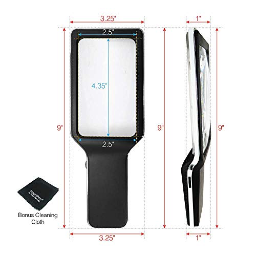 • ★ RECTANGULAR SHAPES THE WAY YOU NATURALLY READ: The rectangular lens is especially design to simulate the way we naturally view things from left to right, the magnifying lens covers large viewing area without having your hands move all the time, lens is measured 4.35"x 2.7" and magnifies up to 300%.