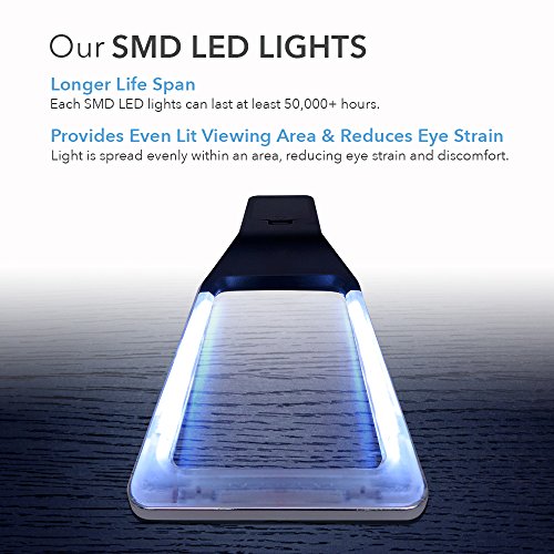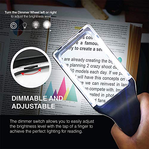 • ★REDUCE EYE STRAIN & DIMMABLE LIGHTING : This led magnifier is clinically proven to be ideal for anyone who strains their eyes to see words on a page because it magnifies and provides light without glare. The roller dimmer allows you to easily adjust the brightness level(peaks at 600 lumens) with the tap of a finger to achieve the perfect lighting for various tasks.