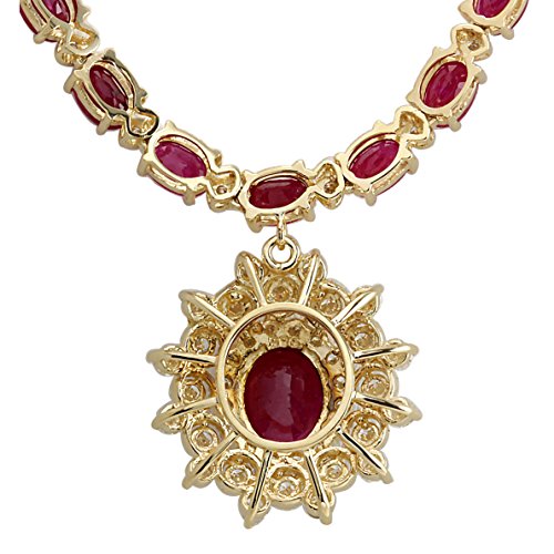 Details: 40.45 Carat Natural Ruby and Diamond 14K Yellow Gold Necklace Item Type: Necklace Item Length: 17 Inches Material: 14K Yellow Gold Mainstone: Ruby Stone Color: Red Stone Weight: 3.15 Carat Stone Shape: Oval Stone Quantity: 1 Stone Dimensions: 9.87x7.87 mm Stone Creation Method: Natural Stone Treatment Method: Heat-treated Gemstone 1: Ruby Stone Color: Red Stone Weight: 34 Carat Stone Shape: Oval Stone Creation Method: Natural Stone Treatment Method: Heat-treated Gemstone 2: Diamond Stone Color: F-G Stone Clarity: VS1-VS2 Stone Weight: 3.3 Carat Stone Shape: Round Stone Creation Method: Natural Stone Treatment Method: Not-treated Total All Stones Weight: 40.45 Carat Total Metal Weight: 15.91 Grams Face Measures: 23.20x22.70 mm Gender: Women Condition: New Made in: USA SKU: 702686W