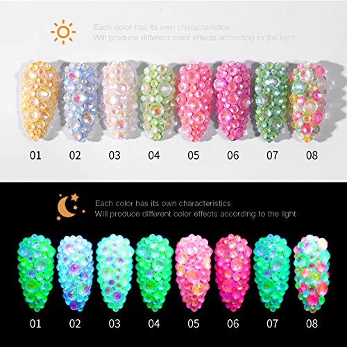 Details: Nail Rhinestones, Luminous AB Crystal Rhinestones with Mixed Sizes, Round Flatback Fluorescent Rhinestones for Nails, 3D Nail Decoration Glow in the Dark, Halloween Nail ArtsWarm Tip:To ensure the luminous effect, enough light shall be absorbed in advance. Packing Included: 8Pack of Luminous Nail Rhinestones (Glue is not included in the package) Perfect luminous rhinestones :8 colors/set, Each color has its own characteristics, and will produce different color effects. meet different design requirements. Very easy to use on long or short nails and saves hours of time vs hand painted nail art kits Can be used to make nail products, can also be used to make other handicrafts, jewelry,You can also use them to decorate your home, cell phone's case, glasses, made card, body art, etc. This fluorescent crystal rhinestones are made from high quality K9 Glass which is pure, solid and transparent. Besides, these nail rhinestones will glow at night as long as the crystal rhinestones absorb enough light from daylight or artificial light. To ensure the luminous effect, enough light shall be absorbed in advance. Please be aware before ordering.