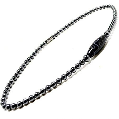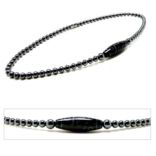 Details: This is for a stylish amulet magnetic hematite necklace, the piece is set with magnetic hematite round beads(6mm) and a 9 Eye Tibetan Dzi agate bead(38mm x 13mm x13mm) with a strong black magnetic clasp enclosure which will hold this fabulous piece in style. Each magnetic hematite Round bead is charged up to Approx. 600-700 Gauss magnetic power. It measures 20" in length and 1/4" in width(Round bead: 6mm). It comes with a nice silver pouch.