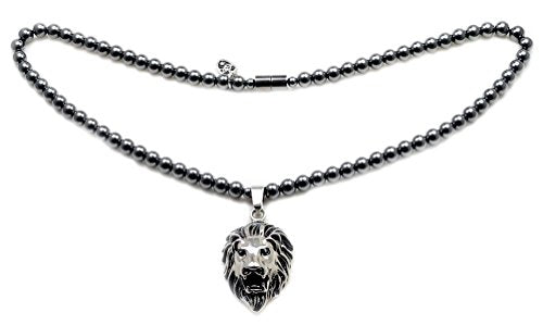 Details: Accents Kingdom  introduces a stylish magnetic hematite necklace, the piece is set with classy gun metal black magnetic hematite round beads(6mm) and a fascinating lion head pendant and a strong seamless black magnetic clasp enclosure which holds this fabulous piece in style. The lion head symbol represents Honor, Courage, Royalty, Strength and Leadership. Each magnetic hematite bead measures Approx. 600-700 gauss power. It is available in 18", 20", 22" and 24" long and 6mm wide. It looks absolutely gorgeous with a pair of jeans or most elegant evening gown, fits perfectly for both men and women.