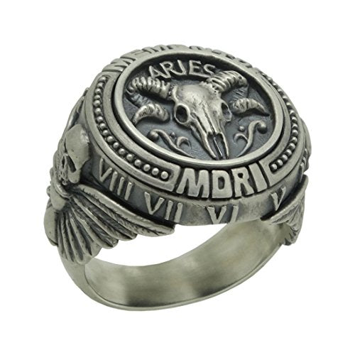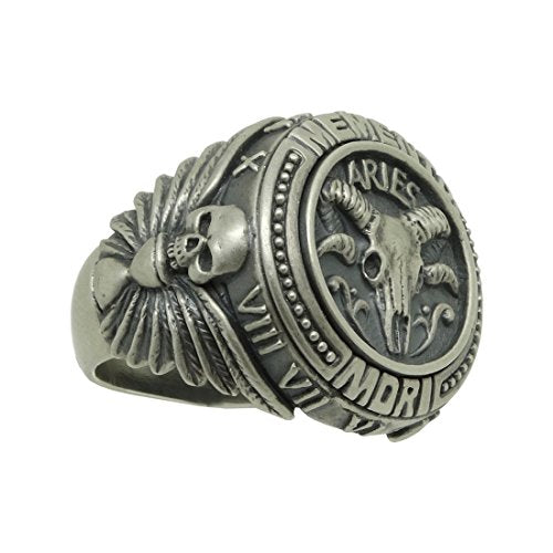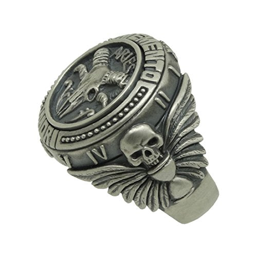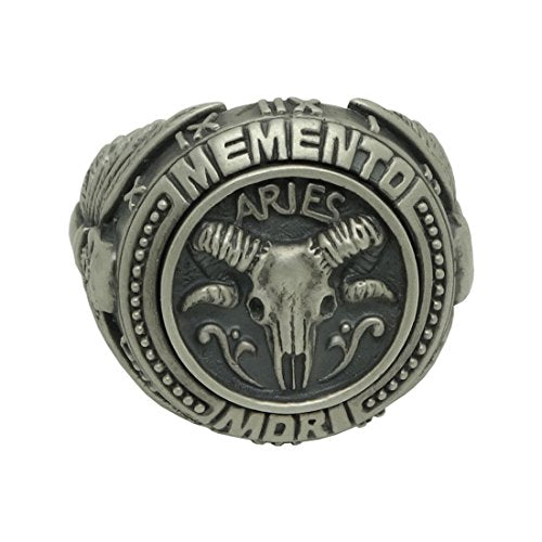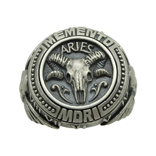 Details: Original unique design with beautiful details and amazing art work Weight 21,23 grams of Sterling Silver,depends on the size of the ring Excellent new condition, heavy, stamped 925 Intricately detailed lines and antique, rustic finish all around Rare piece, top quality, best craftsmanship, custom made Top of ring features the Aries symbol with the sign "memento mori", which means "remember that you have to die". All around the face of the ring there is a Roman numeral clock. The sides of the ring are also very emblematic there are an hourglass with wings up and a skull on both sides. These symbols associate with life, death, permanence, the past, the future, and the temporary. For those conscious of the world's fragility, the hourglass represents life. It was the only symbol that could depict both the past and the present at the same time, so it came to represent both life and death. Its sands would flow regardless of the elements around it-just as a person's life winds down at a steady pace, regardless of their good or bad deeds-so it was also used to instill a fear of death into people.