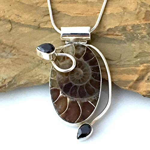 Authentic Well-Preserved AMMONITE Fossil and Black Onyx Gemstones, 925 Sterling Silver, Designer Pendant (1.5" Long) Jewelry with FREE Silver Chain.