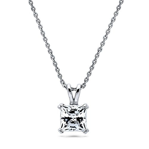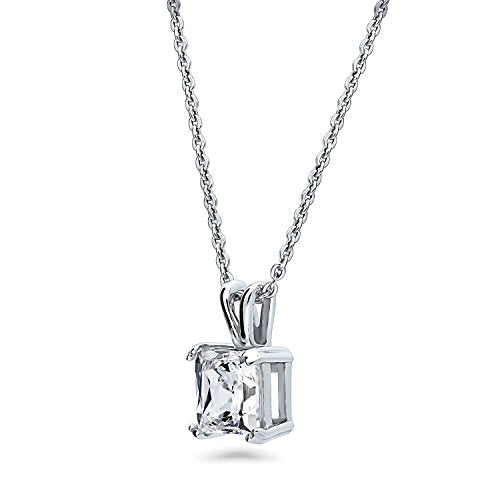 This solitaire pendant necklace will effortlessly illuminate any outfit with its classic cut and undeniable radiance. Made of rhodium plated fine 925 sterling silver. Set with 1.24 carat princess cut clear Swarovski zirconia (6mm) in 4-prong setting. Pendant measures 0.45 inch in length, 0.28 inch in width. Chain measures 18 inch in length, 1mm in width. Lobster claw clasp. Imported.