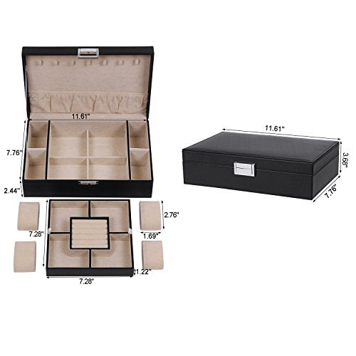 Details: Are your watches and jewelries all over the place? Do you hunt to find the one you want every morning? This black BEWISHOME Jewelry Storage Box with 4 watch slots, 7 necklaces hooks and multifunctional compartments keeps your watches, necklaces, earrings, rings and bracelets neatly organized and within reach, away from dust. This jewelry box allows you to see all your items at a glance, making your daily dressing up quicker and easier. Metal clasp offers a convenient way for opening and closing. The watch cushions are removable, which makes more space for jewels. This modern looking jewellery box - made of high quality PU leather, environmental MDF, velvet lining - is a great choice for organizing jewelries, shop decoration, travelling and gift-giving. Specifications: - Materials: Faux Leather, Medium Density Fiberboard (MDF) and Beige Velvet - Exterior Color: Black - Lining Color: Beige - Overall Dimension: 11.61" L x 7.76" W x 3.68" H (29.7 x 19.7 x 9 cm) - Each Watch Slot: 3.55" L x 1.8" W x 2.28" H (9.0 x 4.6 x 5.8 cm) - Watch Pillows: 2.76" L x 1.69" W x 1.25" H (7.2 x 4.7 x 3.2 cm) - Each Large Bottom Slot: 3.55" L x 3.55" W x 1.1" H (9.0 x 9.0 x 2.79 cm) - Removable Tray for Earrings Rings: 3.35" L x 3.35" W x 1.18" H (8.5 x 8.5 x 3.1 cm) - Net Weight: 2.7 lbs Warranty & Service: BEWISHOME takes responsibility of the quality. If any problems, please send us mail. We will offer solution or compensation within 24 hours. Welcome to order and share your experience.