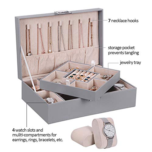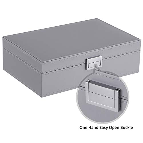 Details: Are your watches and jewelries all over the place? Do you hunt to find the one you want every morning? This BEWISHOME Jewelry Storage Box with 4 watch slots, 7 necklaces hooks and multifunctional compartments keeps your watches, necklaces, earrings, rings and bracelets neatly organized and within reach, away from dust. This jewelry box allows you to see all your items at a glance, making your daily dressing up quicker and easier. Metal clasp offers a convenient way for opening and closing. The watch cushions are removable, which makes more space for jewels. This modern looking jewellery box - made of high quality PU leather, environmental MDF, velvet lining - is a great choice for organizing jewelries, shop decoration, travelling and gift-giving. Specifications: - Materials: Faux Leather, Medium Density Fiberboard (MDF) and Beige Velvet - Exterior Color: Grey - Lining Color: Beige - Overall Dimension: 11.61"L x 7.76"W x 3.68"H (29.7 x 19.7 x 9cm) - Each Watch Slot: 3.55"L x 1.8"W x 2.28"H (9.0 x 4.6 x 5.8cm) - Watch Pillows: 2.76"L x 1.69"W x 1.25"H (7.2 x 4.7 x 3.2cm) - Each Large Bottom Slot: 3.55"L x 3.55"W x 1.1"H (9.0 x 9.0 x 2.79cm) - Removable Tray for Earrings Rings: 3.35"L x 3.35"W x 1.18"H (8.5 x 8.5 x 3.1cm) - Net Weight: 2.6lbs Warranty & Service: BEWISHOME takes responsibility of the quality. If any problems, please send us mail. We will offer solution or compensation within 24 hours. Welcome to order and share your experience.