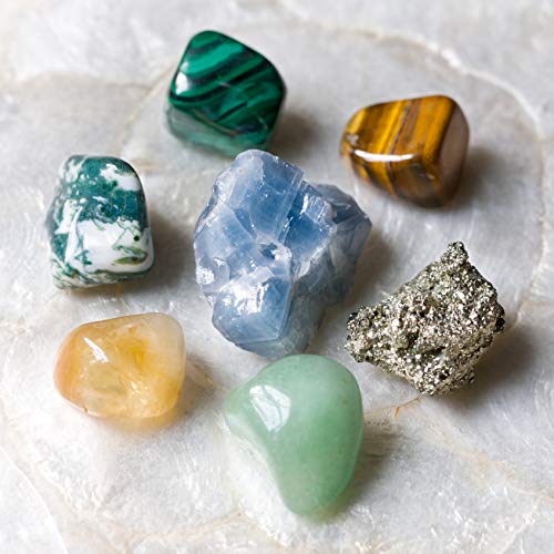 - ✅ PREMIUM VALUE: Your starter set includes some of the main stones for attracting abundance and prosperity - 2 high grade rough stones (Blue Calcite, Pyrite) and 5 high grade tumbled stones (Malachite, Tree Agate, Citrine, Tiger's Eye, Green Aventurine). The photos are an accurate representation of the quality of the stones you will receive. Crystals vary in shape and size from 1"-2".